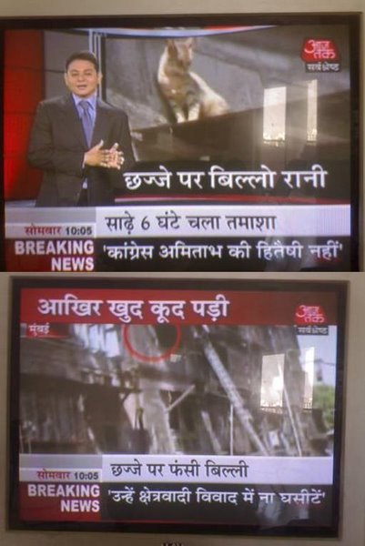 Below: this cat is not even the policfe commissioner’s, she’s just been sitting on a ledge, refusing to move for over six hours now. The anchor seems so happy doing this. Heavy news comes with so much responsibility and asking intelligent, or even intelligible questions requires so much effort. And then there’s Billo Rani the cat. Who then jumped down by herself after all, overcoming her fear of the Aaj tak camera.