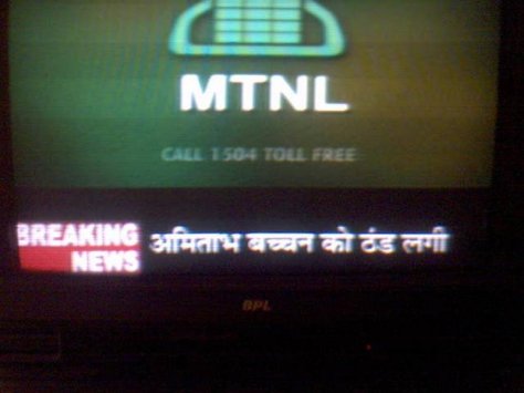 Even when it’s advertisement time, the channel has to run breaking news flashes: this one, I don’t know which channel, says Amitabh Bachchan’s got a cold.