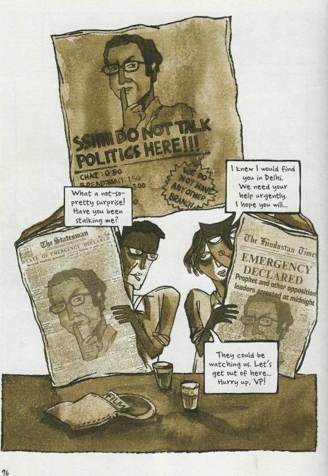 Ghosh writes the story of a time when civil liberties were limited in the name of national security. This book couldn’t have been released at a more apt time. It is a must-read to understand the psyche and logic of nation building in spite of the people who live there. The last panel (shown at the top) of the book is Ghosh’s damning critique to selective collective memory that the nation with Delhi as it Powerpolis holds onto with clenched fists. It reads “Welcome to Delhi. Do not talk about: 1) Emergency, 2)’84 Delhi Riots, 3) Babri Demolition, 4) Gujarat Riots, HAVE A PLEASANT STAY!”
