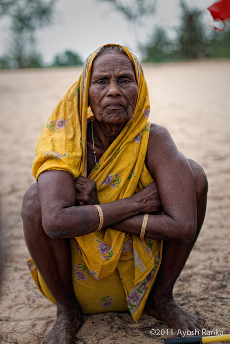 07. An old woman sits in silent protest against the government's plans to aquire forest land for setting up a iron ore extraction plant by South korean steel major, POSCO. She and other villagers in the region have been cultivating betel leaves and cashew on this same land for more than a century and sustaining the ecology.