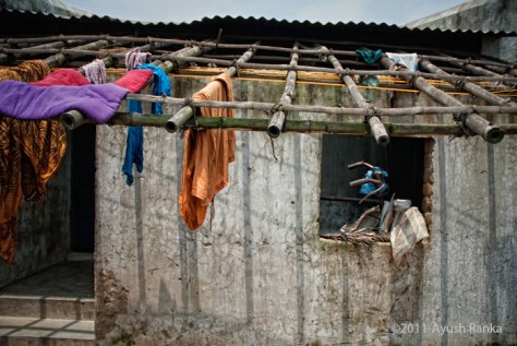 11. Clothes put out to dry outside one of the huts in the transit camp setup by POSCO-India. The transit camp of POSCO, India that has been set-up for the few villagers who are so-called "Pro-POSCO". However, interviews revealed that they have been kept here forcefully since they have nowhere to go and are given Rs.20/- (50 cents) a day per head by the government for all their expenses, including food and other ration. The condition of the camp is abyssmally low. There are about 52 families sharing around 20 toilets and bathrooms. The huts leak when it rains and conditions are extremely unhygienic specially for old people and children.