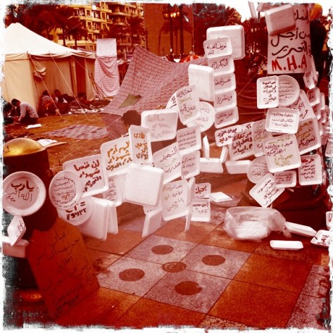 Earlier that morning, in a tent in Tahrir Square a 19-year-old boy told me, “We like to die.” He said he left his home three days ago after he kissed his mother; on the forehead to fight. He told her he may not return. He came to fight for a new system and now he has many different ones to choose from – anarchism to socialism yet none of these ideals are represented in the political parties that will contest tomorrow’s election.