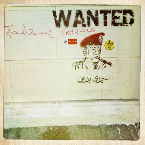 The youth know whom to hate. As the night was turning into day a new face was going up on the wall under a WANTED sign; that of Hamdi Badin. Great pains have taken to stencil his face, each fold of the skin on his neck, the creases on his forehead and the red beret have been painstakingly drawn. Mobiles come out as the job nears its end; the boy painting the graffiti sneaks a quick last minute look and dashes off before his picture can be taken. Hamdi Badin is the Head of the Military Police and it is the Police who are the real protagonists in Tahrir’s story.