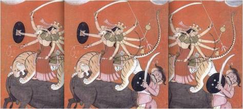 So Durga never gets fully domesticated as Shiva’s wife Parvati, retaining these fierce and unpredictable, untameable elements.