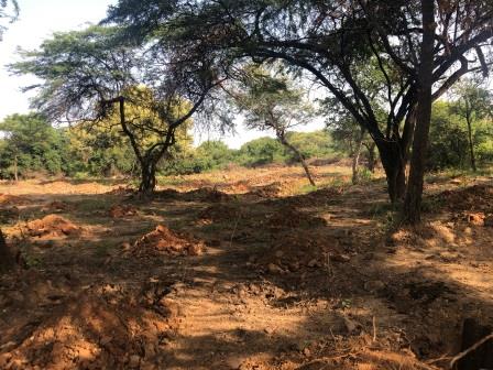 As we were leaving, we must have taken a wrong turn because we suddenly found ourselves in unfamiliar surroundings. I tried to orient myself by the sun and hoped we’d find a good way back when we suddenly came upon complete carnage — heavy earthmoving machinery had cleared, completely swept clean, about 4 or 5 hectares of Ridge forest and a grid of evenly spaced out planting pits gaped open. Ironically, the only things left standing were Prosopis juliflora trees.