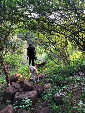 Even in its degraded state, walkways on the Ridge can be devastatingly pretty. This picture was taken in July, showing my daughter Mithva walking one of my dogs