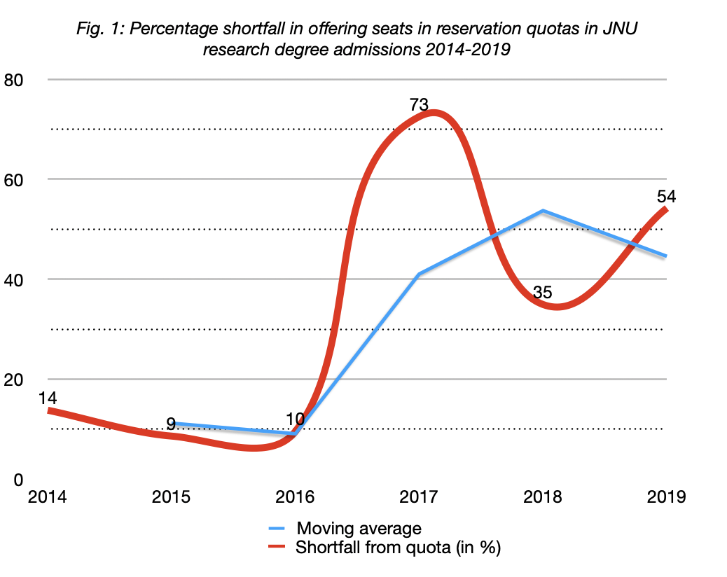 It is a fact that the JNU research admissions have never seen a complete fulfilment of the Constitutionally mandated reservation policy, for the lack of either applicants or candidates meeting the minimum eligibility criteria. Mindful of this, the university’s admission policy was engineered to keep the shortfall as low as possible, but ever since Kumar was handed the reigns, exactly the reverse policy has been pursued. As a consequence, as Fig. 1 shows, where once the moving average (marked by the blue line) of the shortfall in reserved seats offered for admission hovered around 10%, it is now located over 50%.