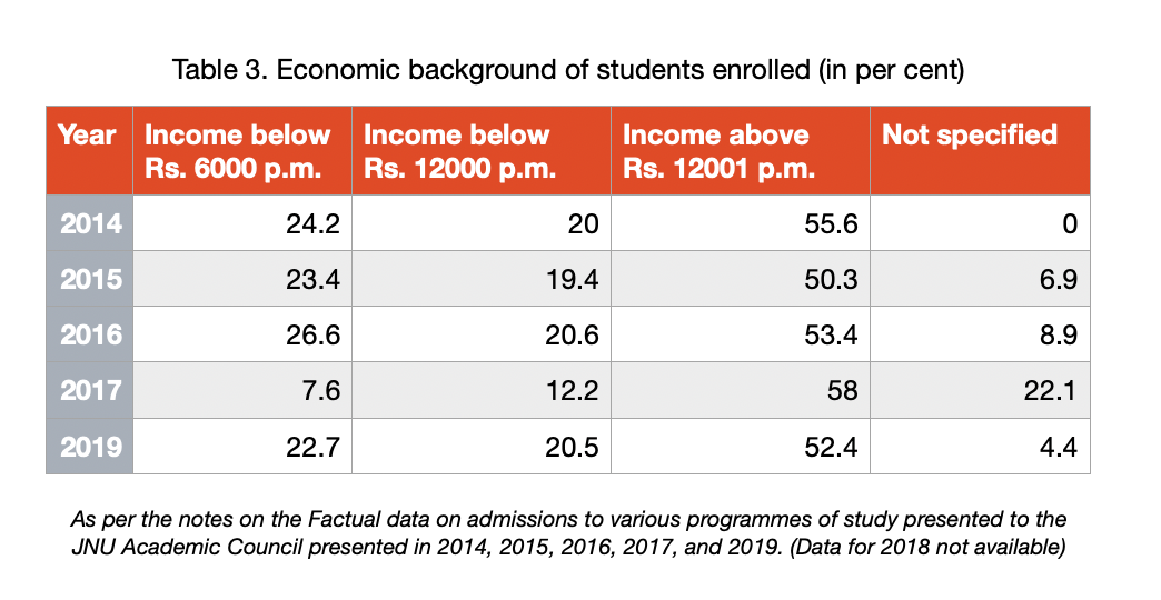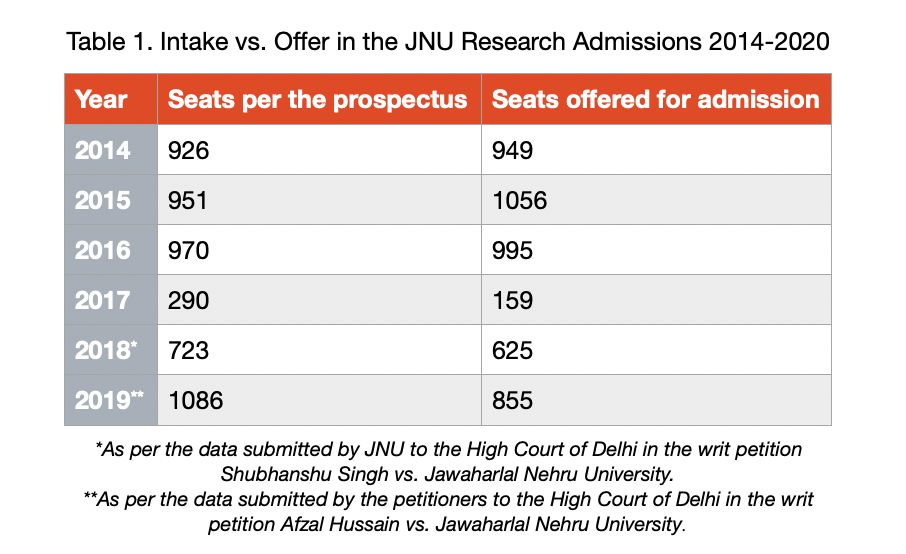 1 A brief note on the sources of data used in this study is in order. For decades, JNU has produced an annual statistical factsheet on admissions that is presented to its Academic Council. Till 2017, this data was a reliable record of the facts, but since the time the JNU administration has been made answerable to multiple legal challenges in the Delhi High Court, this data has fast become degraded. For the 2018 admissions, no factsheet was published, and so the only information available is the one submitted to the Delhi High Court. For the 2019, the data presented to the Academic Council in 2020, does not match the information declared to candidates seeking admission to JNU in that year. The data used for the calculation of intake and offer relied on in this article is the latter, as submitted to the court by the petitioners in Afzal Hussain vs. Jawaharlal Nehru University. Note that this is data which JNU did not dispute in the case, and on the strength of which students were granted admission in January 2020 by court order.