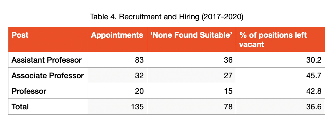 The recent High Court order restraining recruitments to the university until posts de-reserved by its advertisements are restored is in fact only one of the strategies that Kumar has employed. The predominantly used play has been the “None Found Suitable’ decision, by which no selection is made after interview. As Table 4 shows, as of November 2020 (i.e., two months before his term as VC ended), in the 213 selection interviews that Kumar conducted, on 36.6% of the occasions, no selection was made.