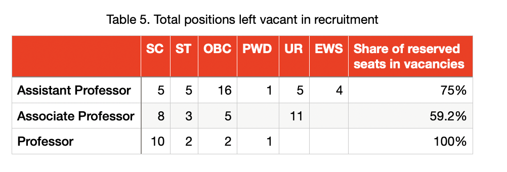 Of the 135 recruitments, only 24 have been of women, i.e., a mere 18.5%. Of these, only 8 were recruited against reserved positions to (4 SC, 4 OBC). Again, this is once again expected under the NEP 2020, which as I have discussed elsewhere, as the NEP 2020 no longer considers the university as a site of ‘women’s empowerment’, as the NEP 2020 1986–92 did.
