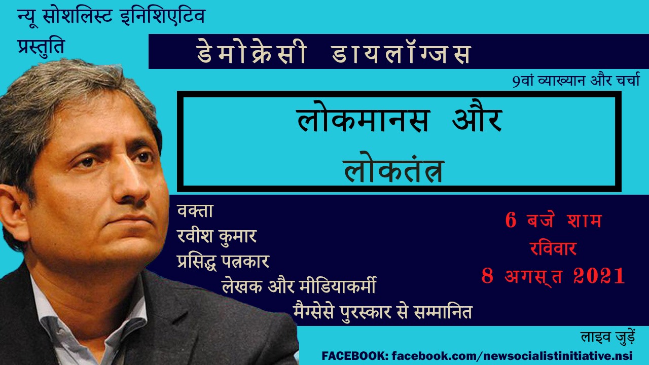 न्यू सोशलिस्ट इनिशिएटिव की तरफ से शुरू की गयी आनलाइन व्याख्यानमाला ‘डेमोक्रेसी डायलॉग्ज’ की अगली कड़ी में मेगसेसे पुरस्कार विजेता, प्रख्यात पत्रकार और विश्लेषक रवीश कुमार हमारे अगले वक्ता होंगे। आप सभी जानते हैं कि रवीश कुमार न केवल एक जानेमाने टीवी एंकर हैं बल्कि भारतीय राजनीतिक-सामाजिक परिदृश्य पर पैनी निगाह रखनेवाले निर्भीक लेखक हैं और साहसी टिप्पणीकार हैं।