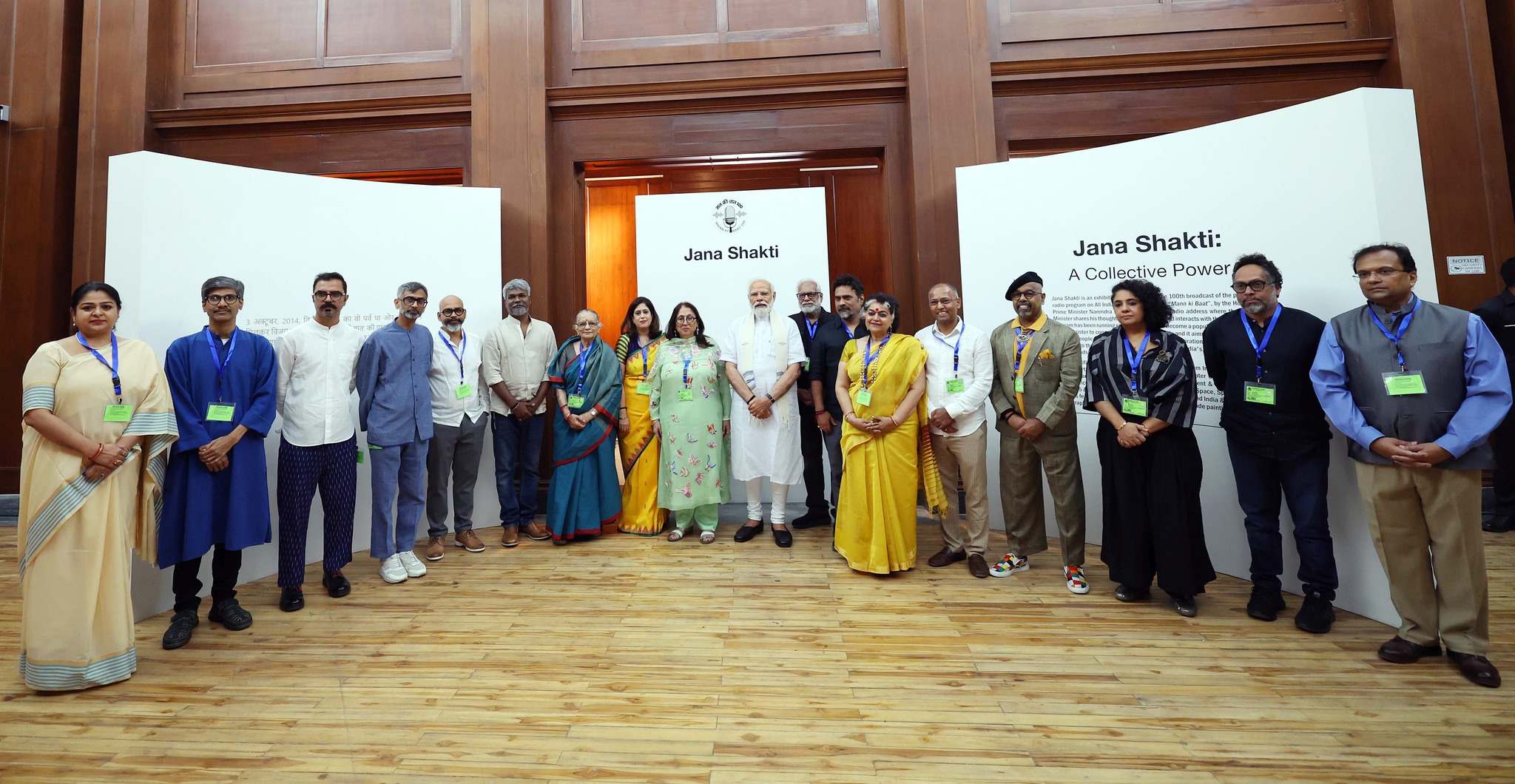 New Delhi, May 14 (ANI): Prime Minister Narendra Modi poses for a photograph with a group while visiting Jana Shakti, an exhibition at the National Gallery of Modern Art in New Delhi on Sunday. (ANI Photo)