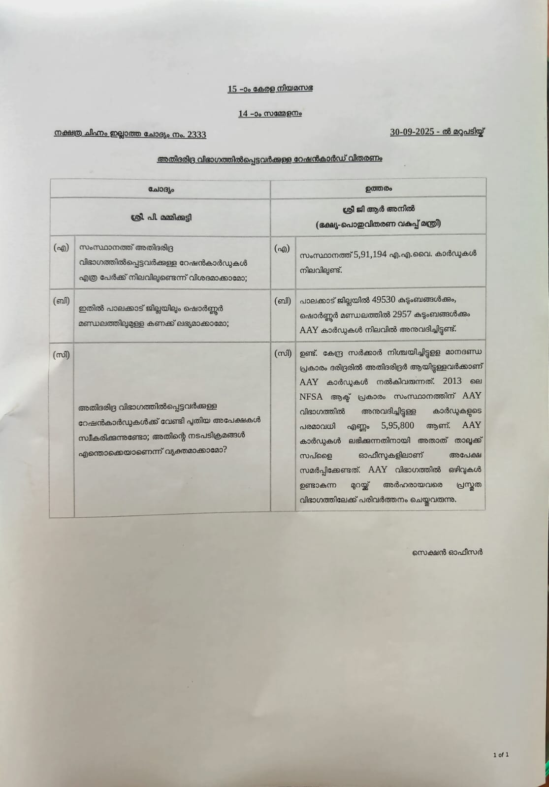 This is the response received by the Shoranur MLA Mammikutti to his unstarred question no 2333, at the 14th session of the fifteenth Kerala Legislative Assembly, around a month back, on 30 Sept. 2025. It says that there are 5, 91, 194 AAY cards in Kerala!