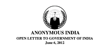 We are Anonymous. It has come to our attention that you have blocked filesharing websites in India. We also know you are in the process of making a Great Indian Firewall, to censor the internet in India. Anonymous believes, however, that pursuing this direction is a sad mistake on your behalf. Not only does it reveal the fact that you do not seem to understand the present-day political and technological reality, we also take this as a serious declaration of war from yourself, the Indian government, to us, Anonymous, the people. Continue reading Open Letter from Anonymous to the Government of India