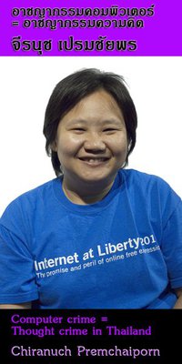 ‘Prachatai’ means “free people” in Thai. Prachatai calls itself an online newspaper, with Thai and English versions. You can see the English version here. Prachatai in the Thai internet universe is a bit like this website, Kafila, only a lot more popular. Prachatai’s webmaster, Chiranuch Premchaiporn, is facing trial for comments posted on the site that allegedly violated Thailand’s lese majeste (insulting the monarch) laws. While the lese majeste charges against the person who wrote that comment have been dropped, Chiranuch is still being charged under lese majeste and other laws, including ‘intermediary liability’ laws. Intermediary liability laws in relation to internet freedom mean that if you post a comment on my site that violates the law, I too will be charged as having abetted the crime. India’s cyber crime laws were amended some time ago to remove the intermediary clause, not because the Government of India was concerned about free speech, but because of Ebay India, whose head was charged and arrested when a user uploaded a pornographic ‘MMS’ on Ebay India that featured minors.