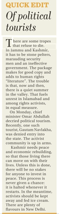 The “Quick Edit” derided human rights work as if it ‘human rights’ is an anti-national and unconstitutional ideology. It supported the Jammu and Kashmir government’s decision to disallow the journalist and human rights activist Gautam Navlakha into the Kashmir Valley. In doing so, it echoed the views of the Jammu and Kashmir chief minister, Omar Abdullah, that activists should be kept away from Kashmir in the summer as they cause political unrest. No wonder that Mr Abdullah recommended the “Quick Edit” on Twitter with a brief comment: “LOL. Short but says it all :-)”.