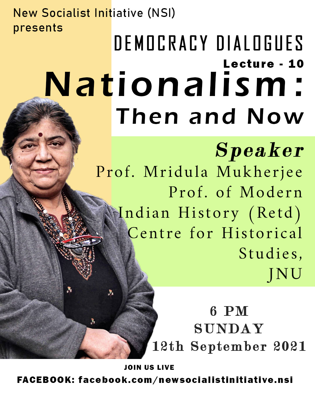 The 10 th lecture in the Democracy Dialogues Series organised by New Socialist Initiative was delivered by Prof Mridula Mukherjee ( Retd.) on Sunday, 12 th Sepember at 6 PM ( IST). She spoke on ‘Nationalism : Then and Now’