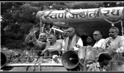 Everyone knew who were the dramatis personae at each level – and practically every bit of evidence that would ever have been required exists, captured in videos and photographs. Our present prime minister was said to be one of the key organizers of the of the Rath Yatra that led up to the demolition and can be seen holding the microphone in his hands in the photograph below.